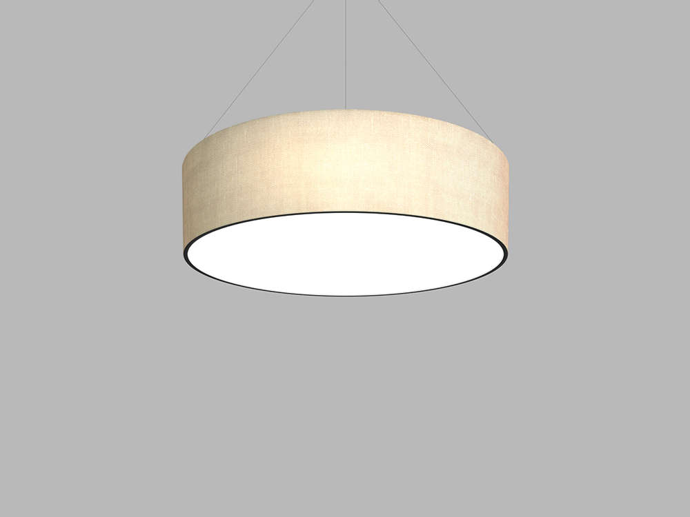 Luminaire housing consists of a circular aluminum frame with a standard depth of 12". The opal acrylic lens on the side walls is enveloped by nonflammable fabric. Direct down light is standard, with the option to specify an indirect up light. Refer to fabric finishes via the following link: https://soleracorp.com/ral.html
