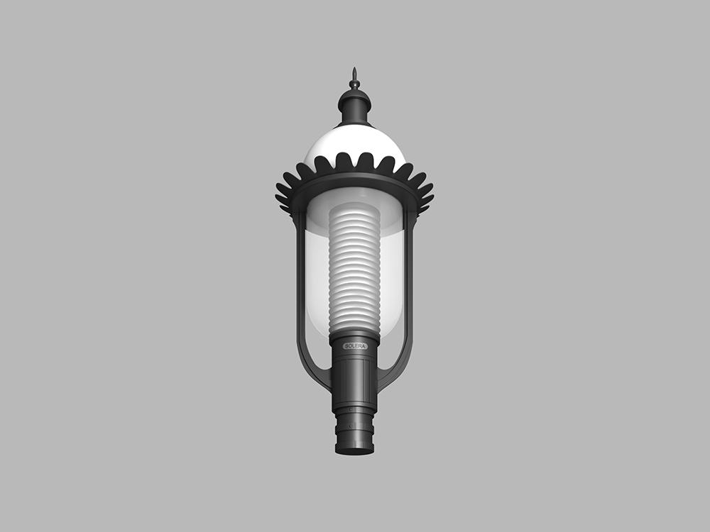 Luminaire housing is constructed of cast aluminum and is comprised of a fitter, arms, dome top, and finial. A clear polycarbonate lens is standard. Select between a Type V or a Type III light pattern.
