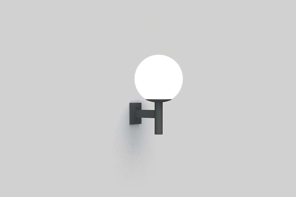 The luminaire features a smooth, spherical globe with aluminum fitter. Standard offering is opal acrylic globe.