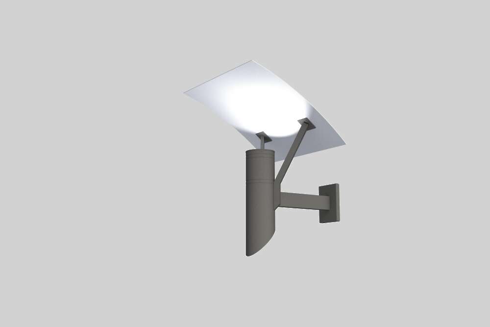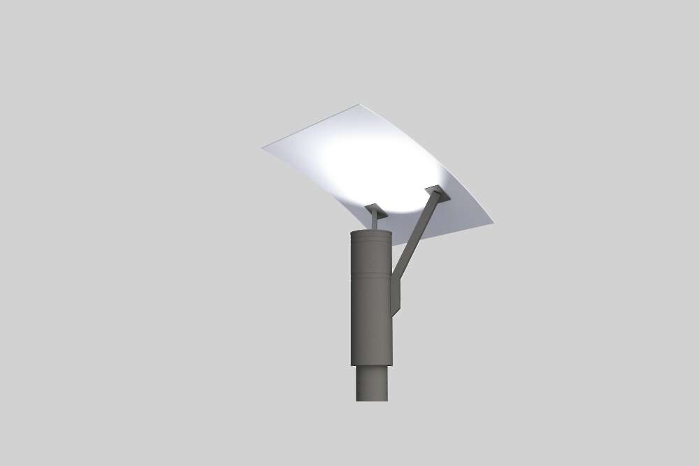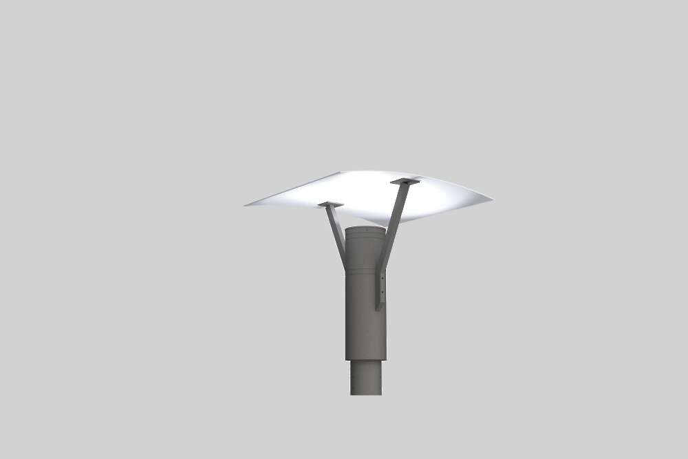 Luminaire housing consists of a cylindrical aluminum base with a clear lens, and a spun aluminum reflector held up by arms emitting light indirectly. The reflector can be faced straight downwards or in an angular manner showing either symmetric or asymmetrical distribution.