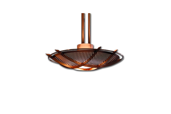 Luminaire housing consists of pendant stems and a perforated dish at the bottom. There is an acrylic lens overlay surrounding the LED module. Direct down light along with a subtle indirect up light is standard. Available in a Copper or Brass finish.