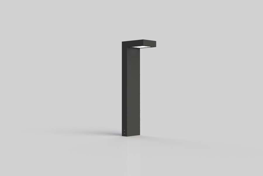 This inverted "L" bollard is made from aluminum extrusion with sharp corners. The head assembly consists of clear lens with light illuminating directly downwards. The standard bollard height is 40".