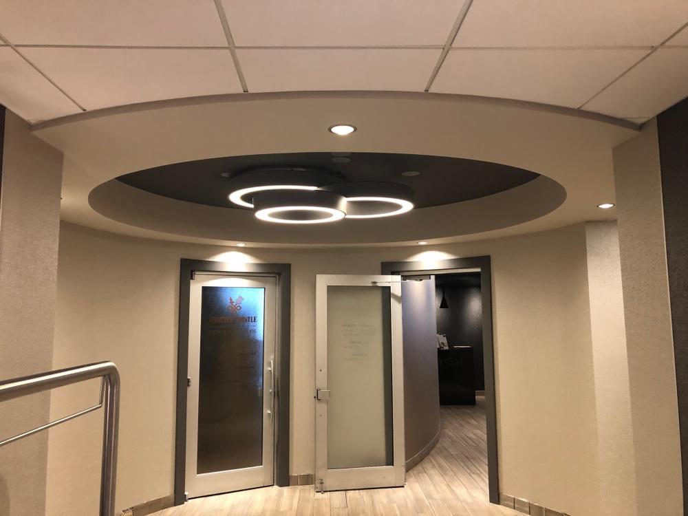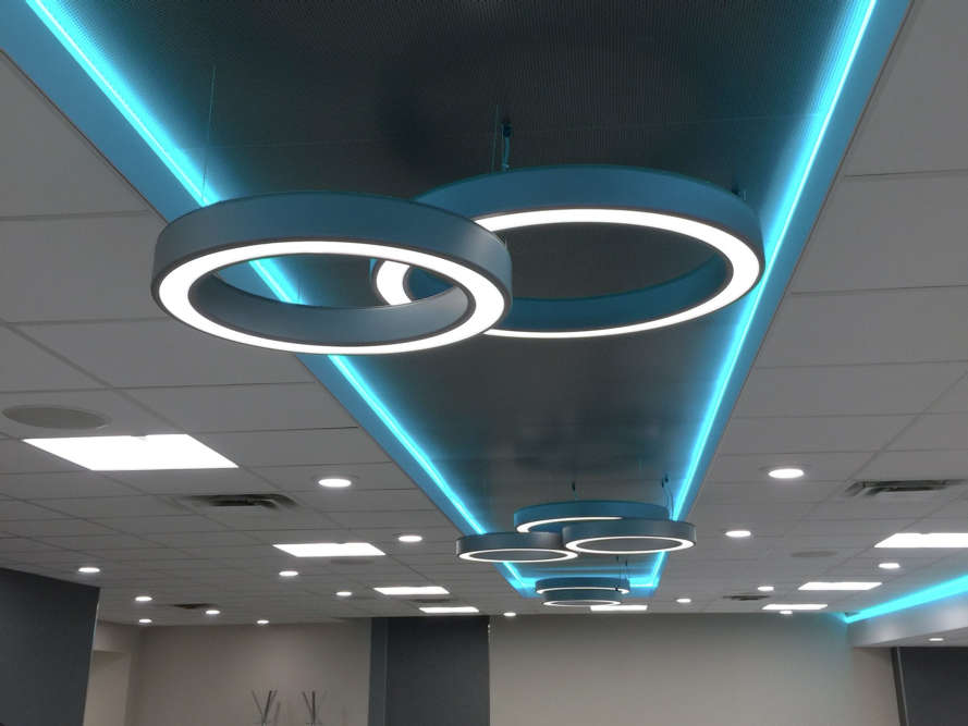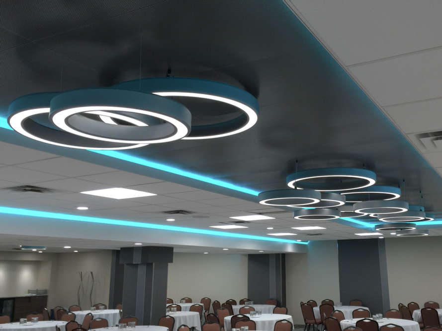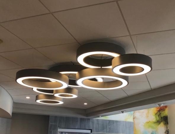 Solera provided CIRC-III pendant clusters for a Travelodge in Regina, SK. This variation of the CIRC (Circular) series houses a lens on the bottom (standard), also, with an option of specifying an up light as well. Luminaire comes in various diameters and can be mounted in several different arrangements.